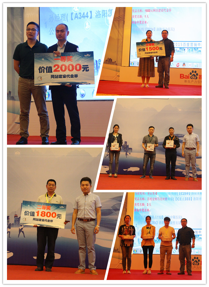 在會議進行當(dāng)中,我們也設(shè)置了幸運抽獎環(huán)節(jié),由百度公司渠道部區(qū)域總經(jīng)理董榮華先生,百度公司渠道部區(qū)域總監(jiān)郭曉鵬先生和百度公司市場部區(qū)域經(jīng)理劉方豪先生分別抽取了參會的幸運朋友,同時送上了百度的精美禮品,分別是三等獎價值一千五百元的網(wǎng)站建設(shè)代金券、二等獎價值一千八百元的網(wǎng)站建設(shè)代金券和一等獎價值兩千元的網(wǎng)站建設(shè)代金券各一個,更有幸運獎共九名獲得百度馬克對杯、小熊酸奶機、百度發(fā)財熊u盤。